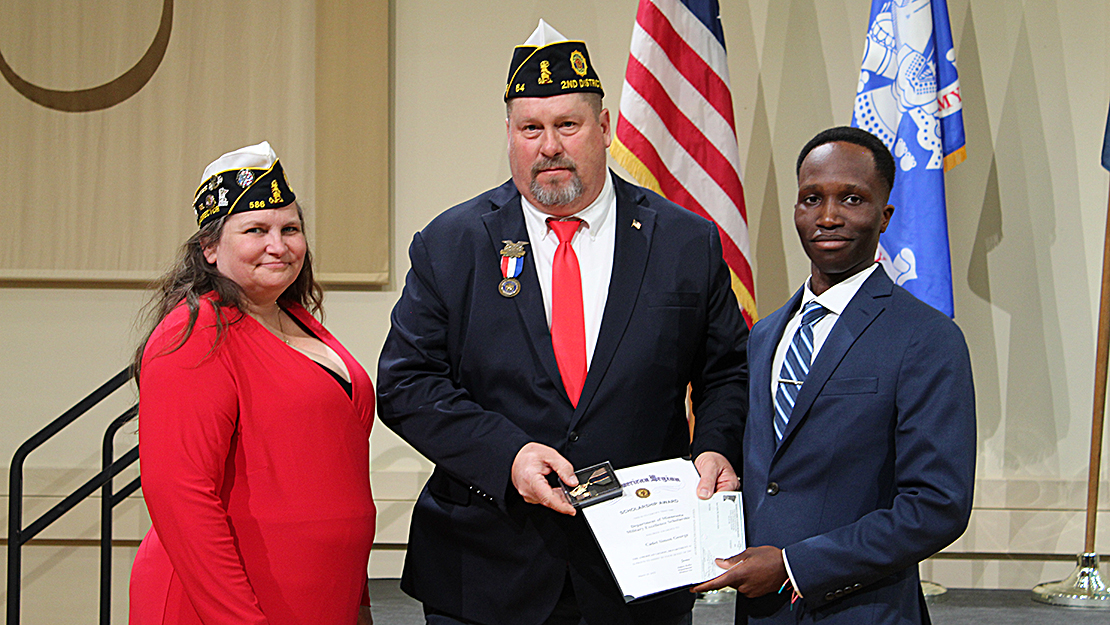 Legionnaires Amy Larson and Brad Pagel present a National Security Committee Scholarship at the Maverick Battalion ROTC ball on March 20 in Mankato.