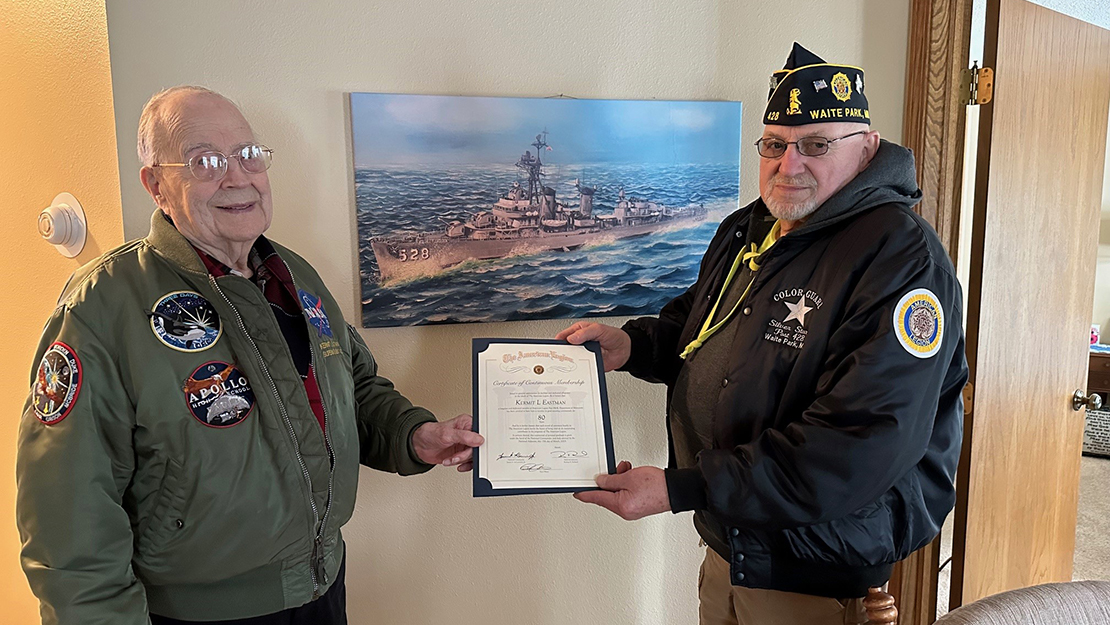 Waite Park Post 428 Commander Joe Cordie presents an 80-year certificate to Kermit Eastman, 98.