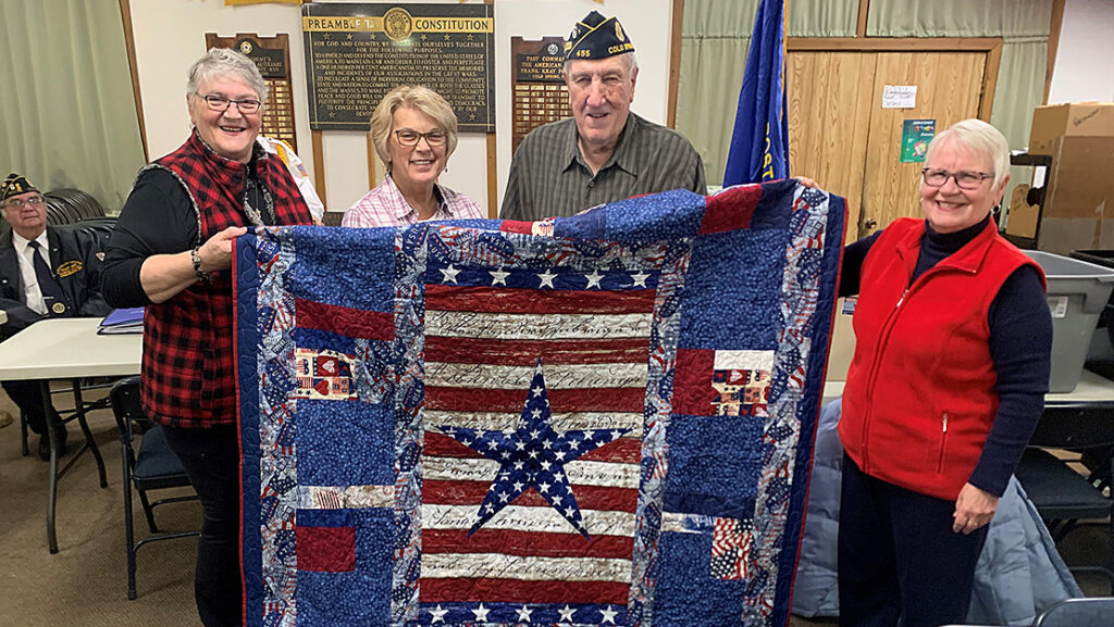 Cold Spring Post 455 initiated the services of the Eden Valley Patriot Quilters to make its first presentations of 15 one-of-a-kind personalized quilts delivered free of charge to its members, many of whom are hospitalized, in nursing homes or in assisted living facilities. Pictured from left are Vicki Peschon, Deb Hesse, Past Commander Dave Johannes and Deb Mayer.