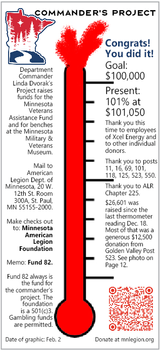 As of the last issue of The Minnesota Legionnaire, which was sent to the press on Feb. 5, she had received $101,050. Her goal was $100,000, so she was at 101 percent of her goal. She made a giant leap since the Dec. 18 reading of the thermometer, climbing $26,601, of which $12,500 was from Golden Valley Post 523.