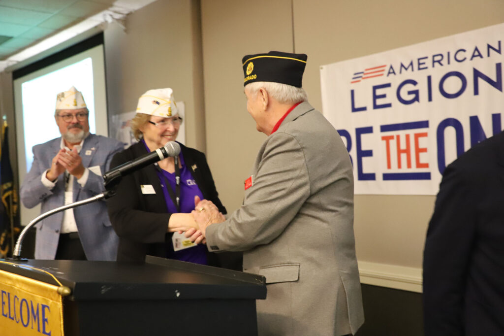 Minnesota Commander Linda Dvorak greets candidate Jay Bowen at the Fall Conference.