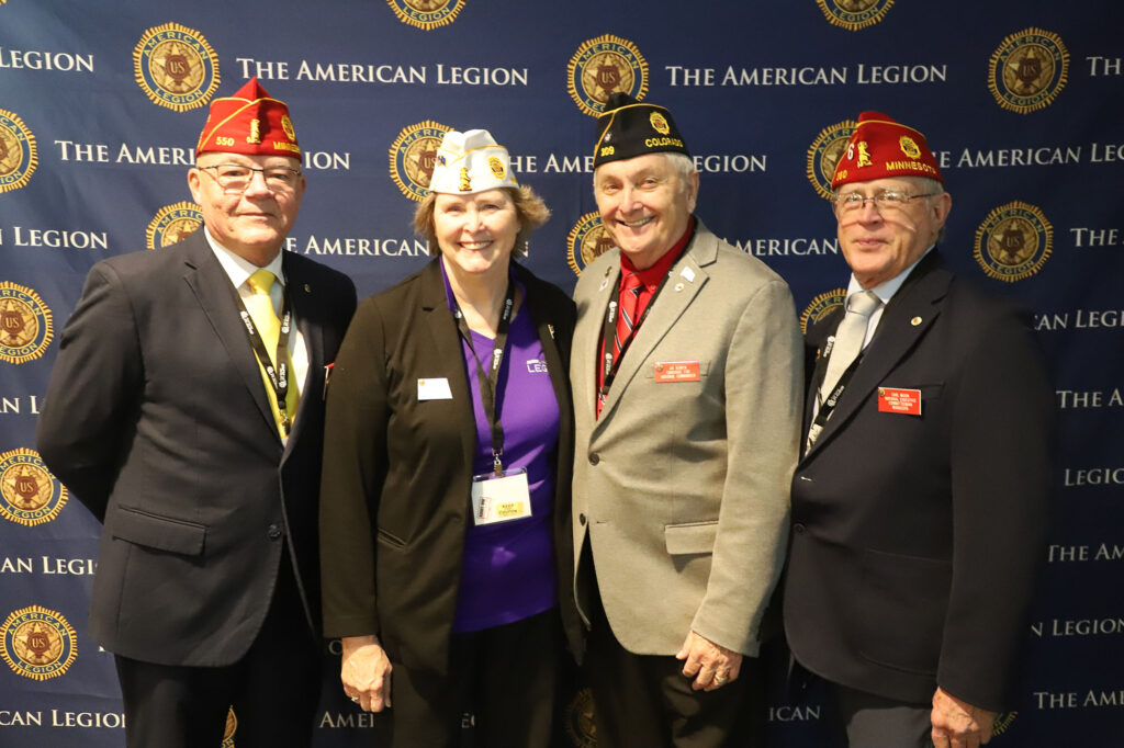 From left are Alternate NECman Paul Hassing, Department Commander Linda Dvorak, leading national commander candidate Jay Bowen of Colorado and NECman Carl Moon. Hassing is with Bloomington Post 550. Dvorak is New Prague Post 45, and Moon is Zimmerman Post 560. Bowen is with Colorado Springs Post 209.
