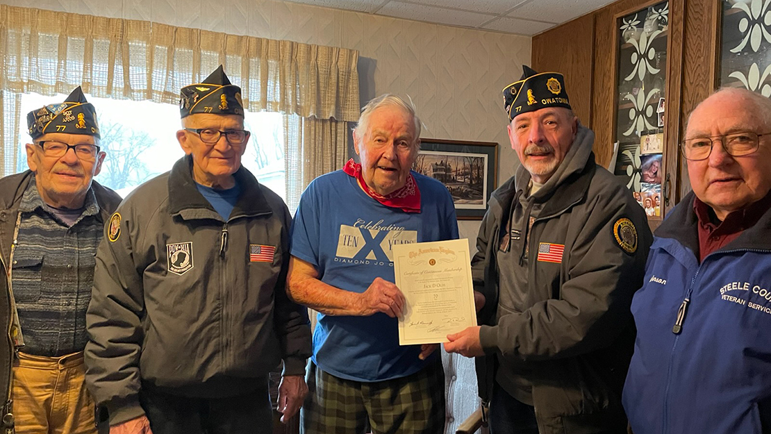 Members of Owatonna Post 77 present Jack Olds with his 70-year continuous membership certificate. Olds served in the U.S. Navy for four years during the Korean War.