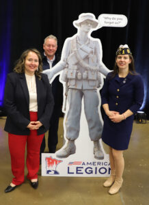 The American Legion Department of Minnesota produced a stand-up cutout image of the “Monument to the Living” statue on the Capitol grounds. He says. “Why do you forget us?” In this photo, from left, are state Rep. Emma Greenman of Minneapolis, Deputy Commissioner Eric Meittunen and Department Legislative Chair Kristy Janigo.