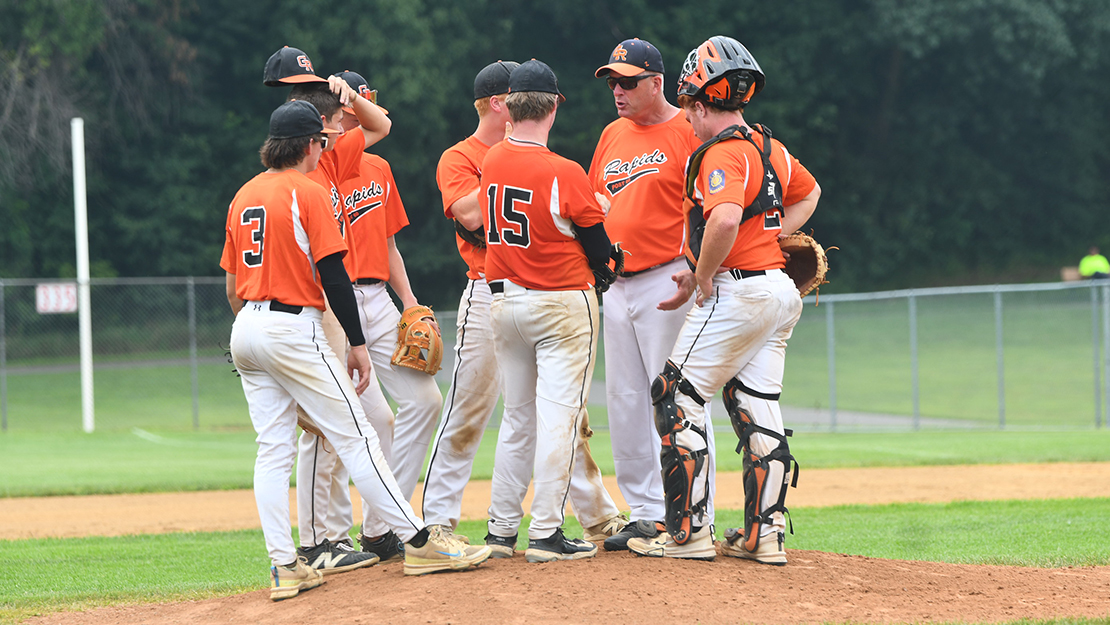Grand Rapids Post 60 coach Bill Kinnunen has a mound conference with his players.