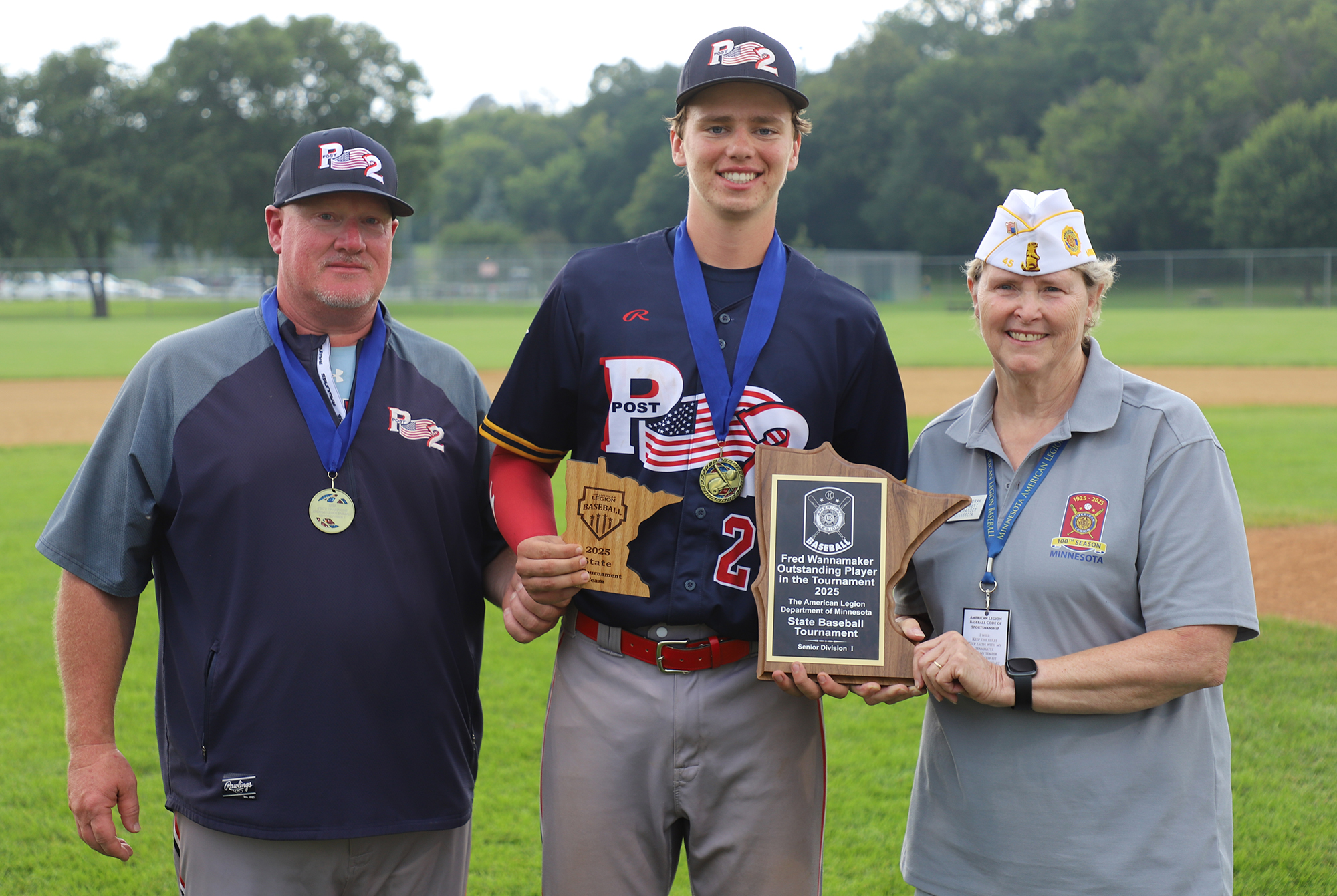 Ryder Peace was the recipient of the Outstanding Player of the Tournament Award. Here he is with his coach, Dave Johnson, and Minnesota American Legion Commander Linda Dvorak.