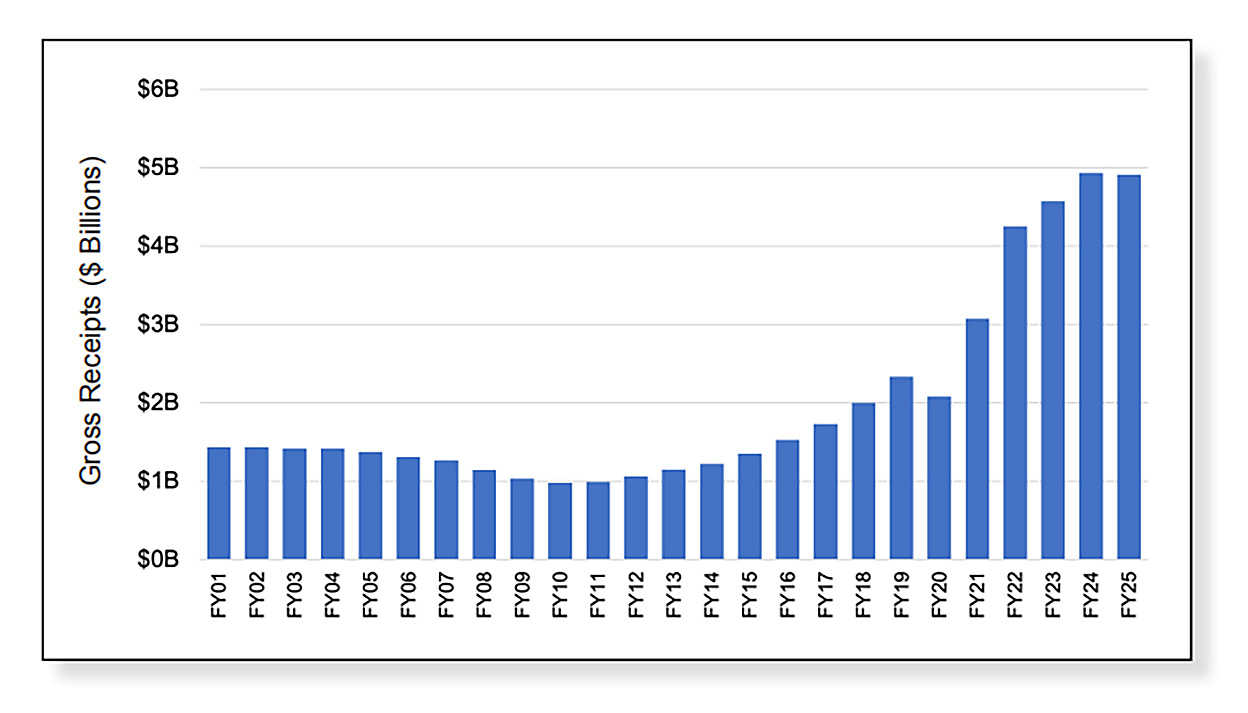 FY2024 net receipts were $709,696,072. FY2025 came to $711,452,397, an increase of a quarter of 1 percent.